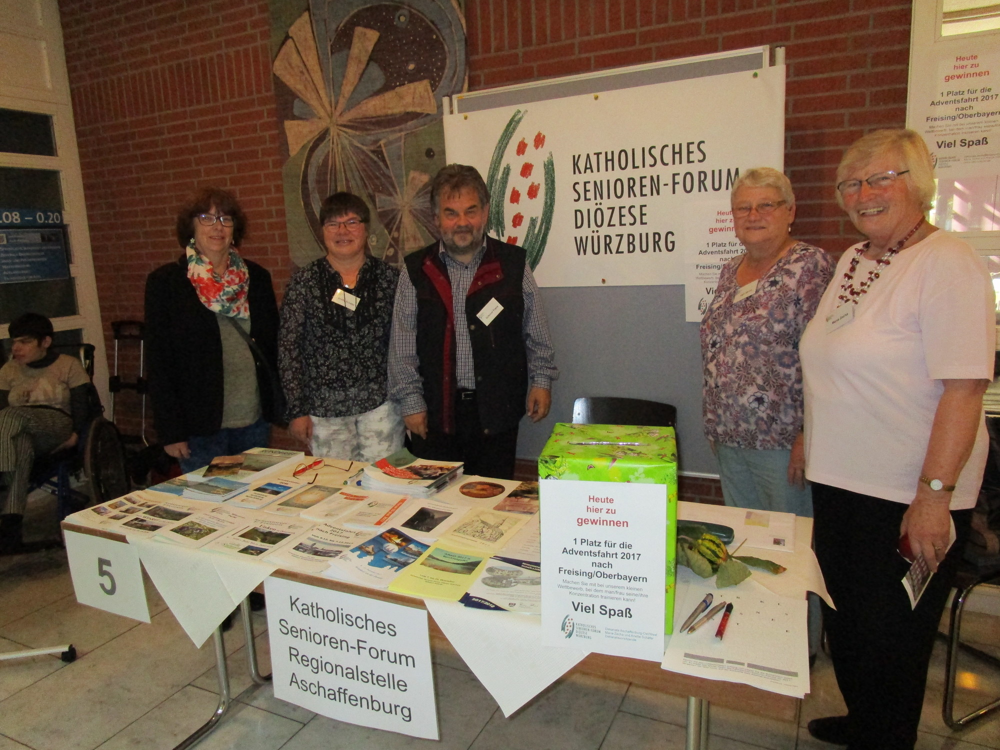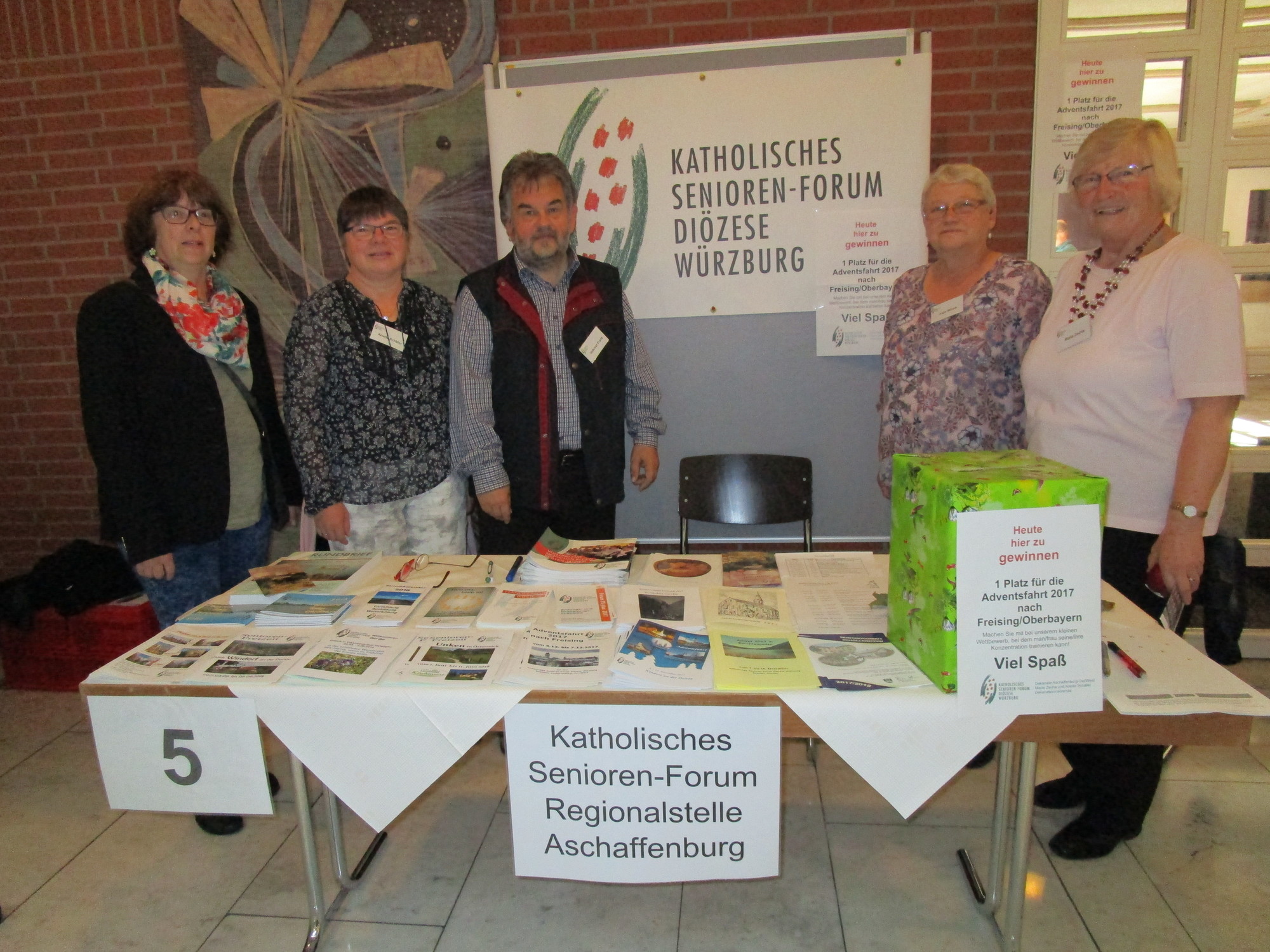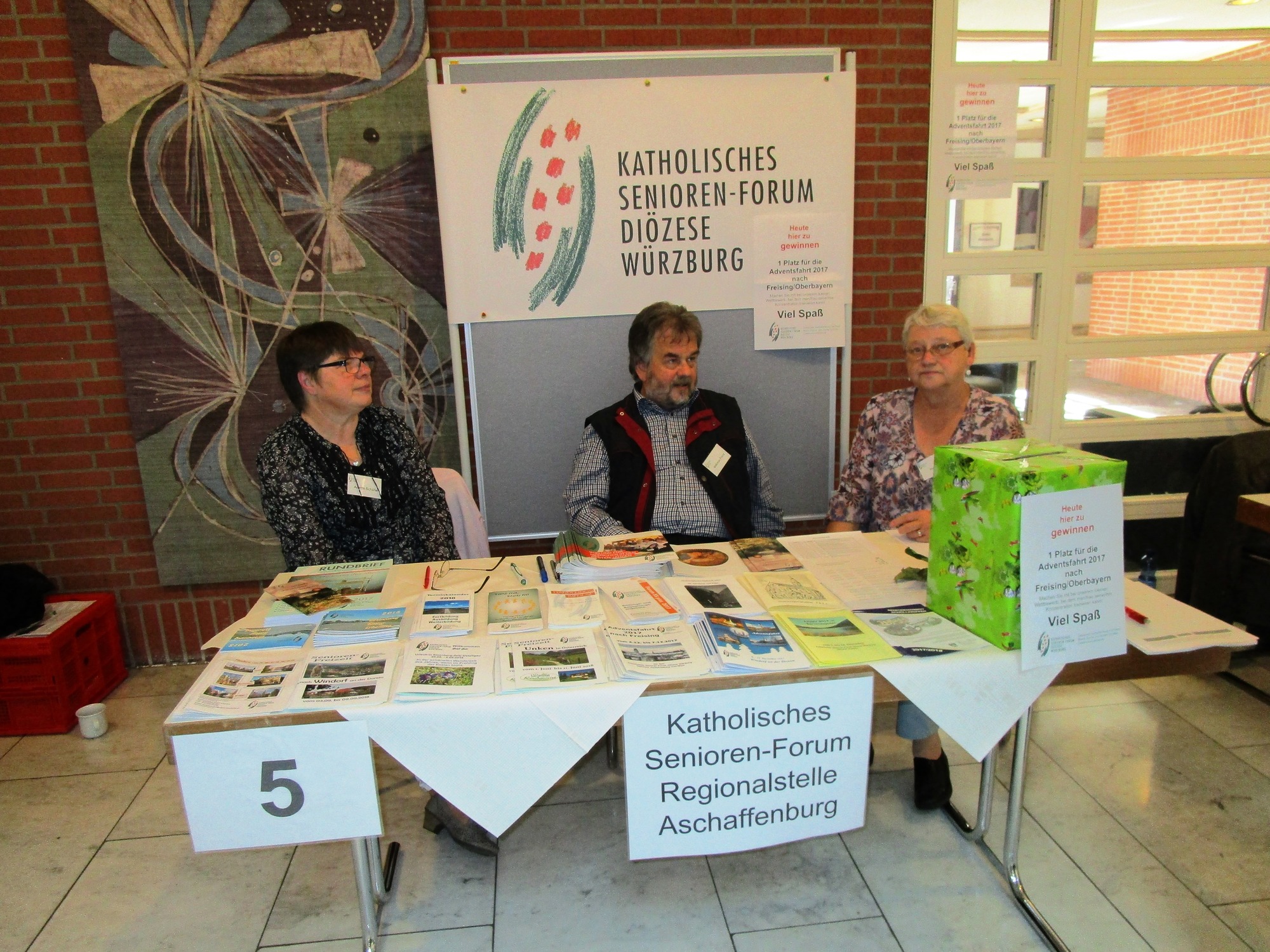 Wir, das sind in diesem Fall die drei Landkreis-Dekanate Alzenau, AB-Ost, und AB-West. Wir hatten viele Informationen auf unserem Tisch vorbereitet, über unsere Freizeiten, die Fortbildungsangebote und die Programme von Seniorengruppen vor Ort. Am Stand waren wir vertreten mit folgenden Vorstandsmitgliedern: Inge Mirow und Ursula Hohaus (Dekanat Alzenau), Anette Schäfer, Maria Zecha und Erika Kunkel (Dekanate AB-Ost/West). Es kamen recht viele Seniorinnen und Senioren, allerdings blieb der ganz große Ansturm bei diesem Tag aus. Positiv war, dass wir mit vielen anderen "Ausstellern" in Kontakt kamen. Wir hatten ein eigenes Preisrätsel vorbereitet mit einem Platz bei einer Adventsfahrt als Hauptgewinn!